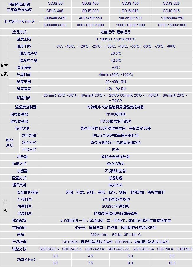 光照/臭氧/橡胶/材料老化箱 湿热老化箱 产品型号:GDJS-50 产品概述: 湿热老化箱适用于测试和确定电工、电子及其他产品及材料进行高温、低温、或恒定试验的温度环境变化后的参数及性能。 在线咨询 详细介绍 湿热老化箱的产品介绍:湿热老化箱适用于测试和确定电工、电子及其他产品及材料进行高温、低温、或恒定试验的温度环境变化后的参数及性能。结构特点 :1、原装法国进口“泰康”制冷机组及全套制冷配件。制冷方式采用单级或双级复叠制冷(风冷或水冷)。2、原装日本 进口温控仪表(恒定温热箱除外)输入方式PT100传感器。3、内胆为优质进口不锈钢板,外壳为A3钢板静电喷涂。4、不锈钢鳞片高效电加热器。 湿热老化箱技术参数: